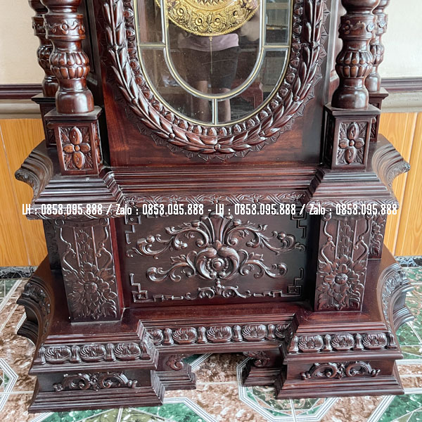 Thân đồng hồ: Được làm từ gỗ tự nhiên cao cấp, phủ màu nâu trầm ấm, bề mặt nhẵn bóng, vừa bền chắc vừa mang lại cảm giác ấm cúng. Các chi tiết chạm khắc cầu kỳ ở phần thân thể hiện sự công phu của nghệ nhân, tôn vinh giá trị nghệ thuật.