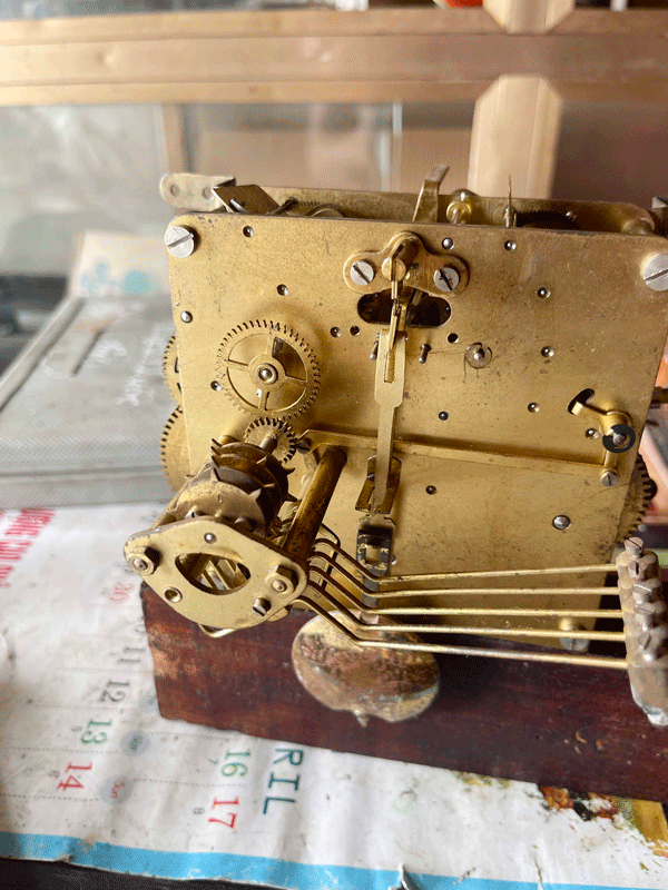Chiếc đồng hồ để bàn vai bò 5 gông hoạt động theo cơ chế máy cơ 8 ngày – chỉ cần lên cót 1 lần mỗi tuần. Khi muốn lên cót, bạn sử dụng chìa khóa đi kèm, tra vào lỗ cót trên mặt số và xoay nhẹ theo chiều kim đồng hồ đến khi cảm thấy căng tay thì dừng, tránh vặn quá mức gây hỏng lò xo. Hệ thống 5 gông thép sẽ phát ra âm thanh báo giờ và nửa giờ, với tiếng chuông trầm ấm, ngân vang nhờ búa gõ chính xác vào từng thanh gông.
